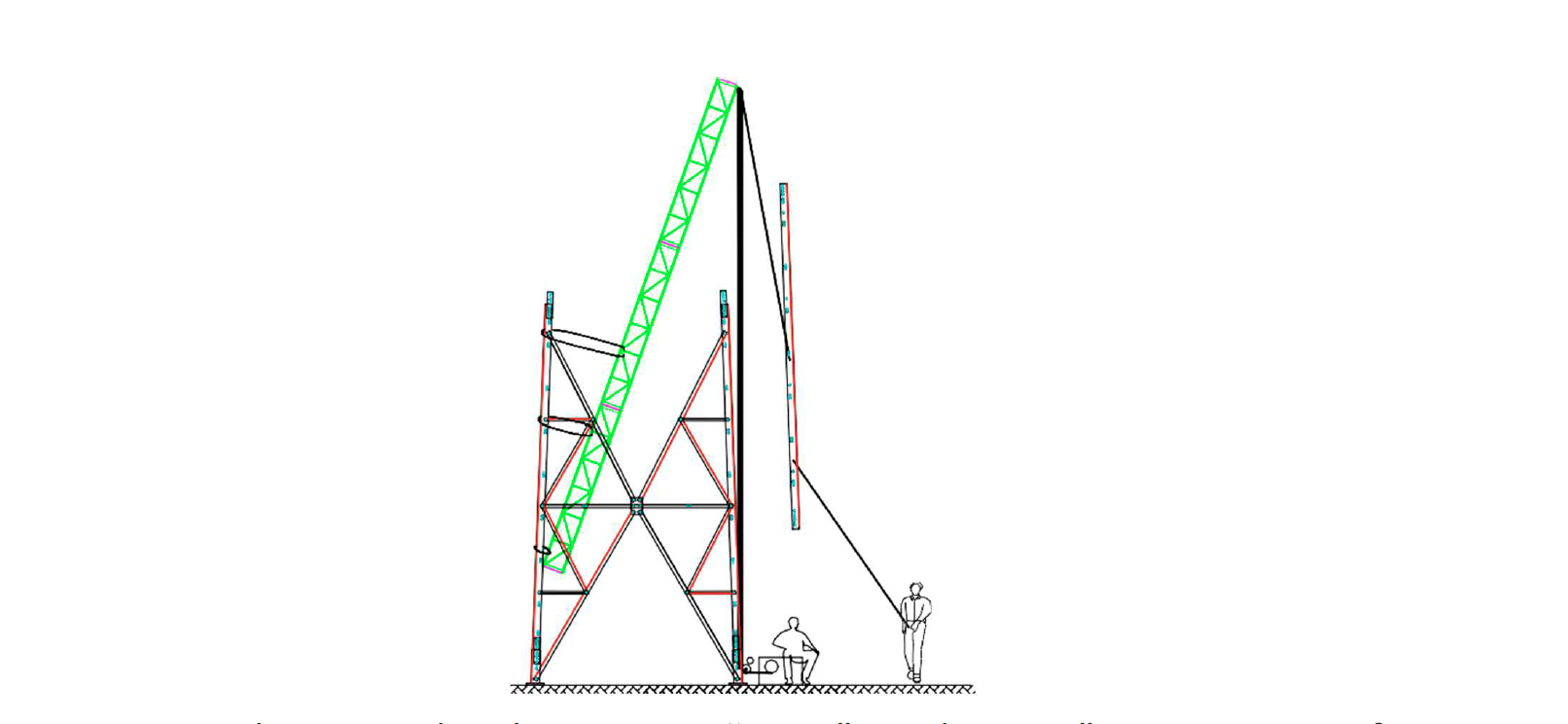 6. Realocação do Pau de Carga: Ela é realizada com a elevação do conjunto completo, amarrando a ponta do cabo na base do pau de carga, elevando em seguida o conjunto de forma manual ou com o guincho até o topo do módulo recém-instalado, repetindo o processo até que a torre atinja a altura final.