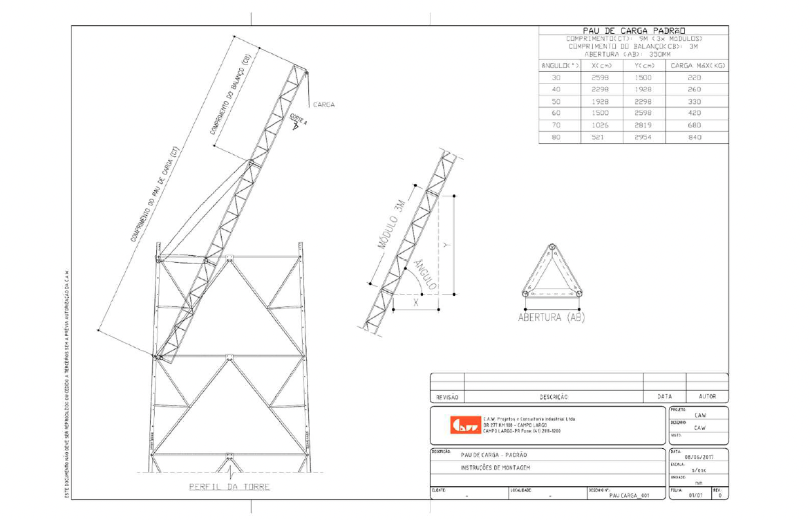 Podem ser utilizadas diversas configurações de Pau de Carga, cada uma com características específicas de comprimento, peso e capacidade de carga, adaptadas a diferentes necessidades de montagem de torres. Abaixo, uma visão geral dos modelos utilizados pela CAW: